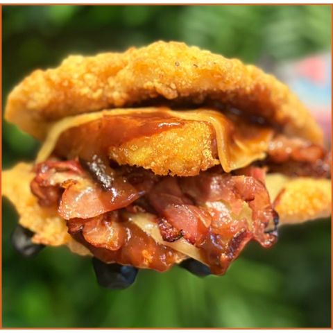 Southern Fried Chicken BurgerSouthern Fried Chicken Fillet, Monterey Jack Cheese, Crispy Bacon, Crispy Onion, Lettuce, Tomato, Mayo & Bbq Sauce