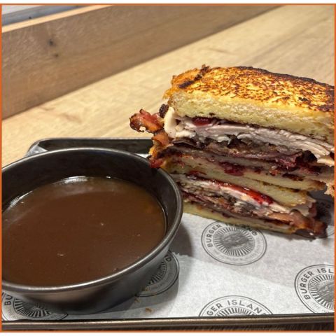 Festive ToastieSliced turkey, sausage patty, crispy bacon, stuffing, cranberry, sandwiched between 2 thick slices of brioche french toast with a pot of dipping gravy