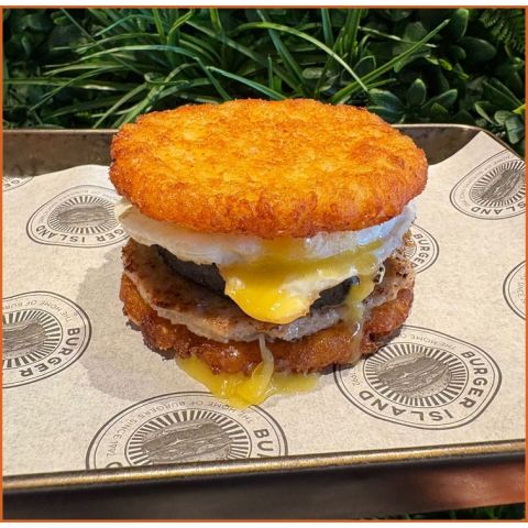 Hash Brown SandwichSausage patty, black pudding and egg sandwiched between two cripsy hash browns
