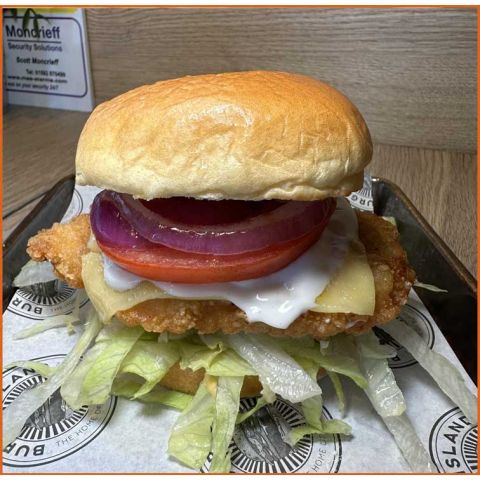 Chicken BurgerButtermilk Chicken Fillet, Monterey Jack Cheese, Lettuce, Tomato, Red Onion & House Mayo -