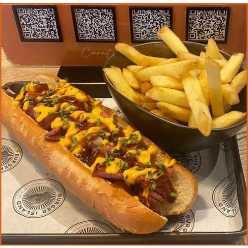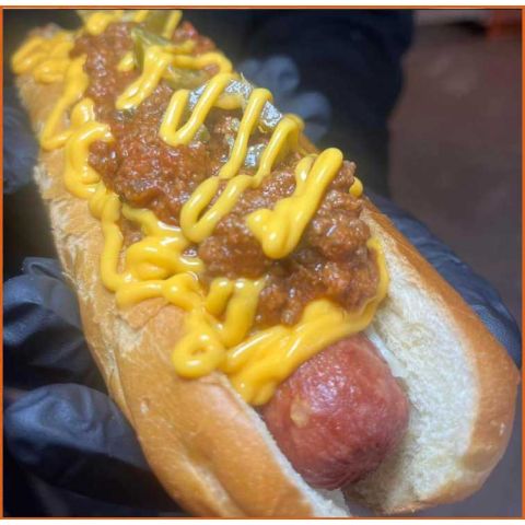 Chilli DogGerman Hot Dog, Mozzarella, House Chilli Dog, Jalapenos & Cheese Sauce -