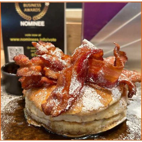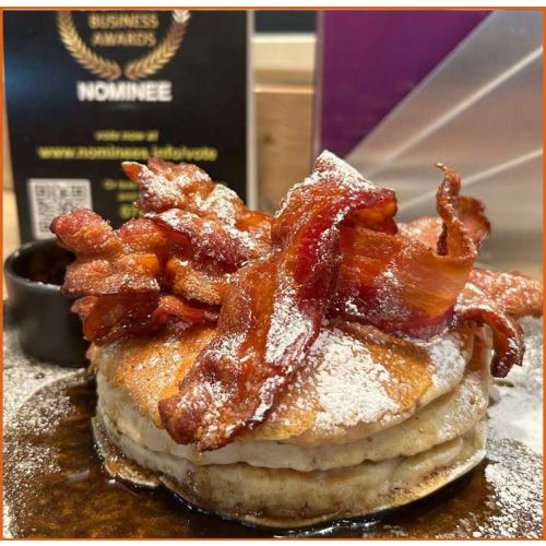 Crispy Bacon & Maple Syrup Buttermilk Pancakes3 homemade buttermilk pancakes -