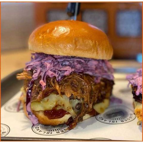 Pulled Pork gluten free2x Beef Patty, Monterey Jack Cheese, BBQ Pulled Pork, BBQ Sauce, House Slaw in a Gluten Free Bun