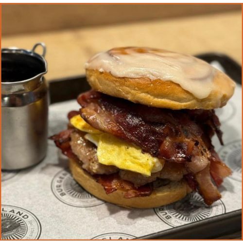 Cinnamon BunSausage patty, streaky bacom, hash brown and cheesy omelette between a chinnamon bun with a side of syrup