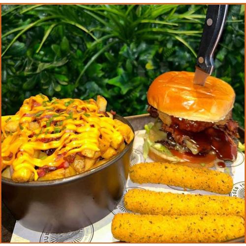 Salt & Pepper Stack BurgerSalt & Pepper Chicken Fillets, Mozzarella Sticks, Monterey Jack Cheese & Curry Sauce -