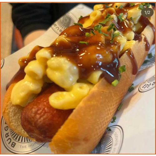 Mac & Cheese DogGerman Hot Dog, With Bacon Bits, Homemade Mac & Cheese & Bbq Sauce -